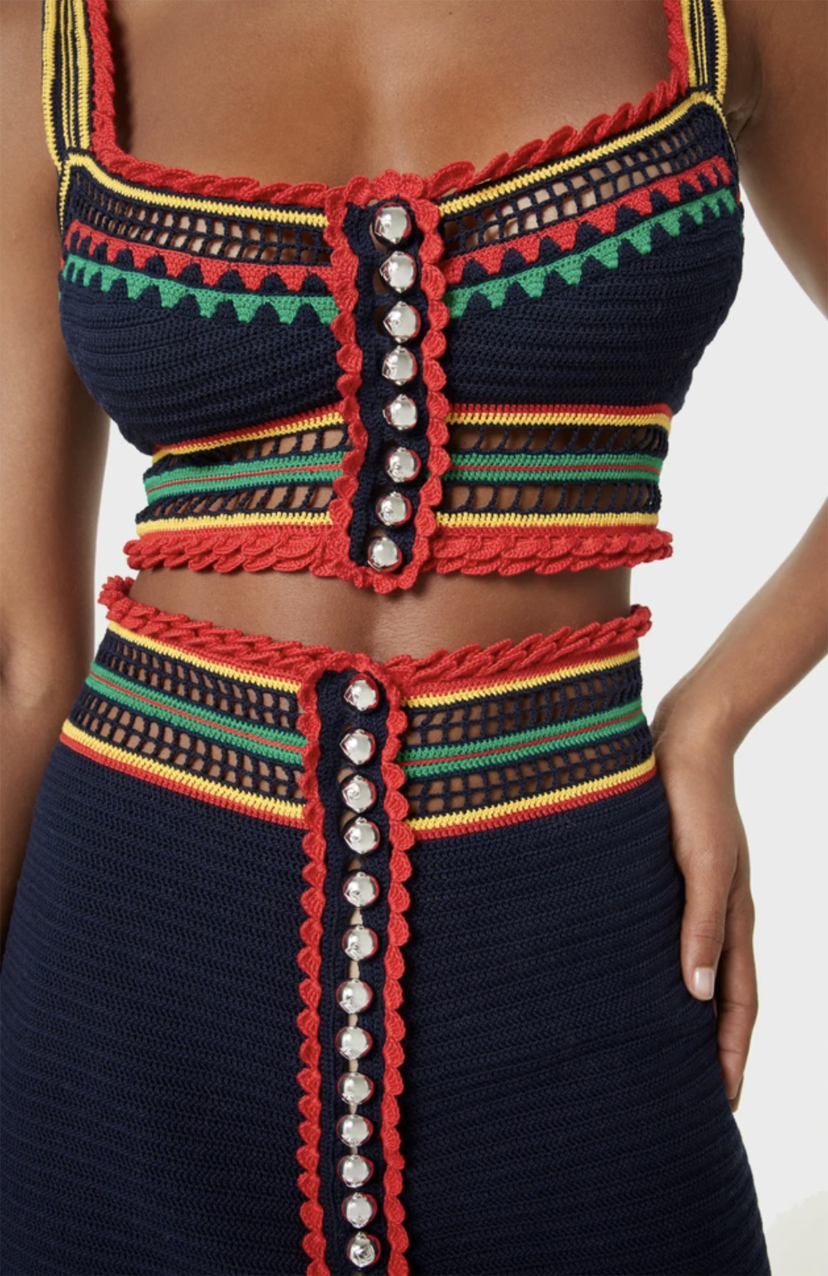 Ce top court navy est doté d’un col V sublimant la silhouette. Plusieurs détails crochetés ainsi que de boutons siglés “PR“ au centre composent le top.