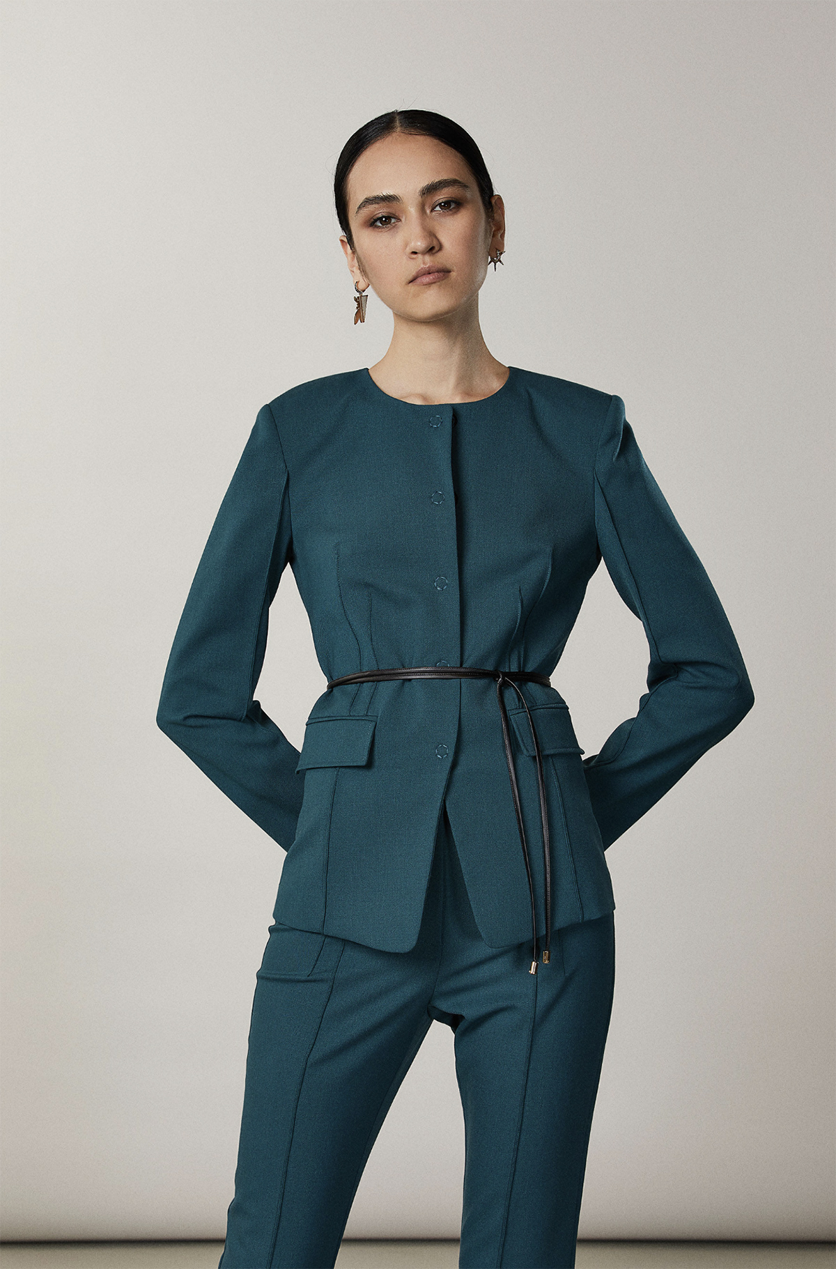 Cette veste au cœur couture affiche une touche féminine et minimaliste chic. Le design ras de cou et les lignes épurées se prêtent à des looks sensationnels, avec le pantalon assorti. Choisissez une ceinture de la collection pour mettre en valeur la taille.
