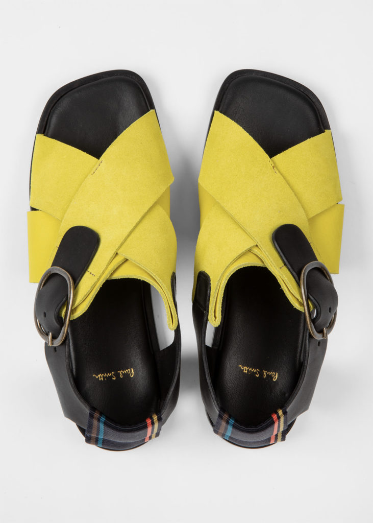 Confectionnées en Italie à partir de daim lisse et de cuir, ces sandales ‘Izzy’ jaunes et noires sont dotées d’une fermeture à boucle à la cheville en laiton et d’une bordure à rayures en gros-grain au talon.