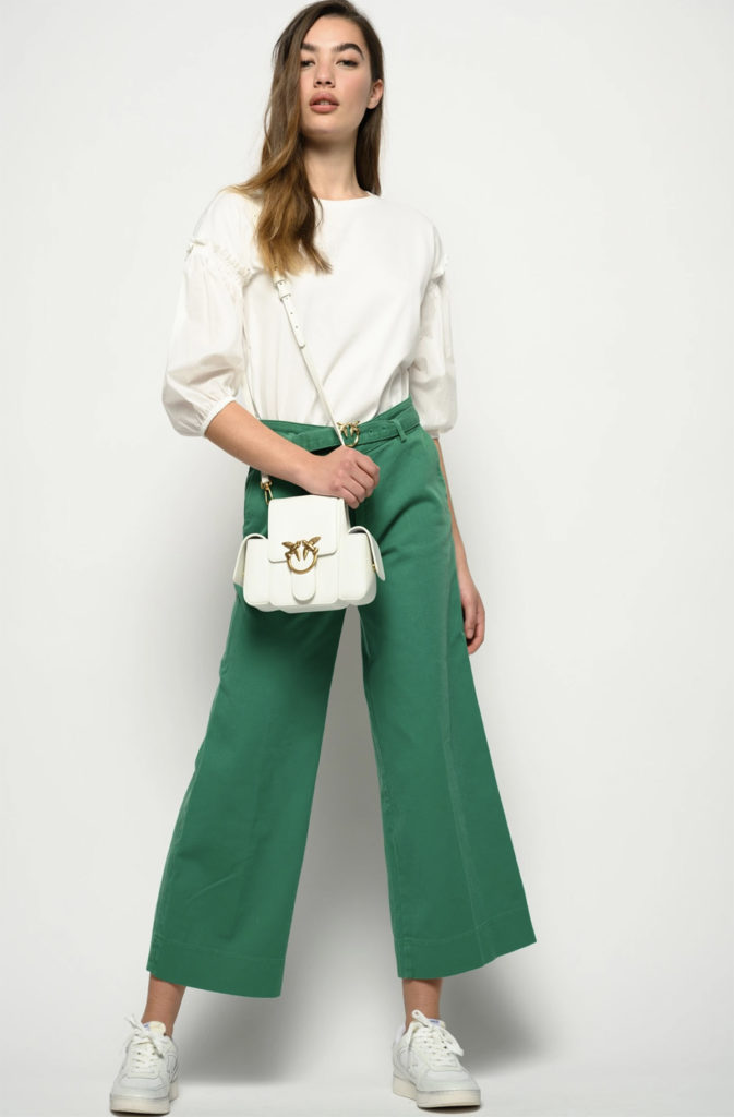 Pantalon palazzo slim en bull denim confortable. Poches obliques sur le devant, longueur cropped à larges revers. Taille mi-haute avec passants pour ceinture et ceinture fine assortie dotée d’une boucle en métal ornée des oiseaux Love Birds. Poches obliques sur le devant et poches plaquées à l’arrière. Fermeture à glissière avec bouton à rivet.