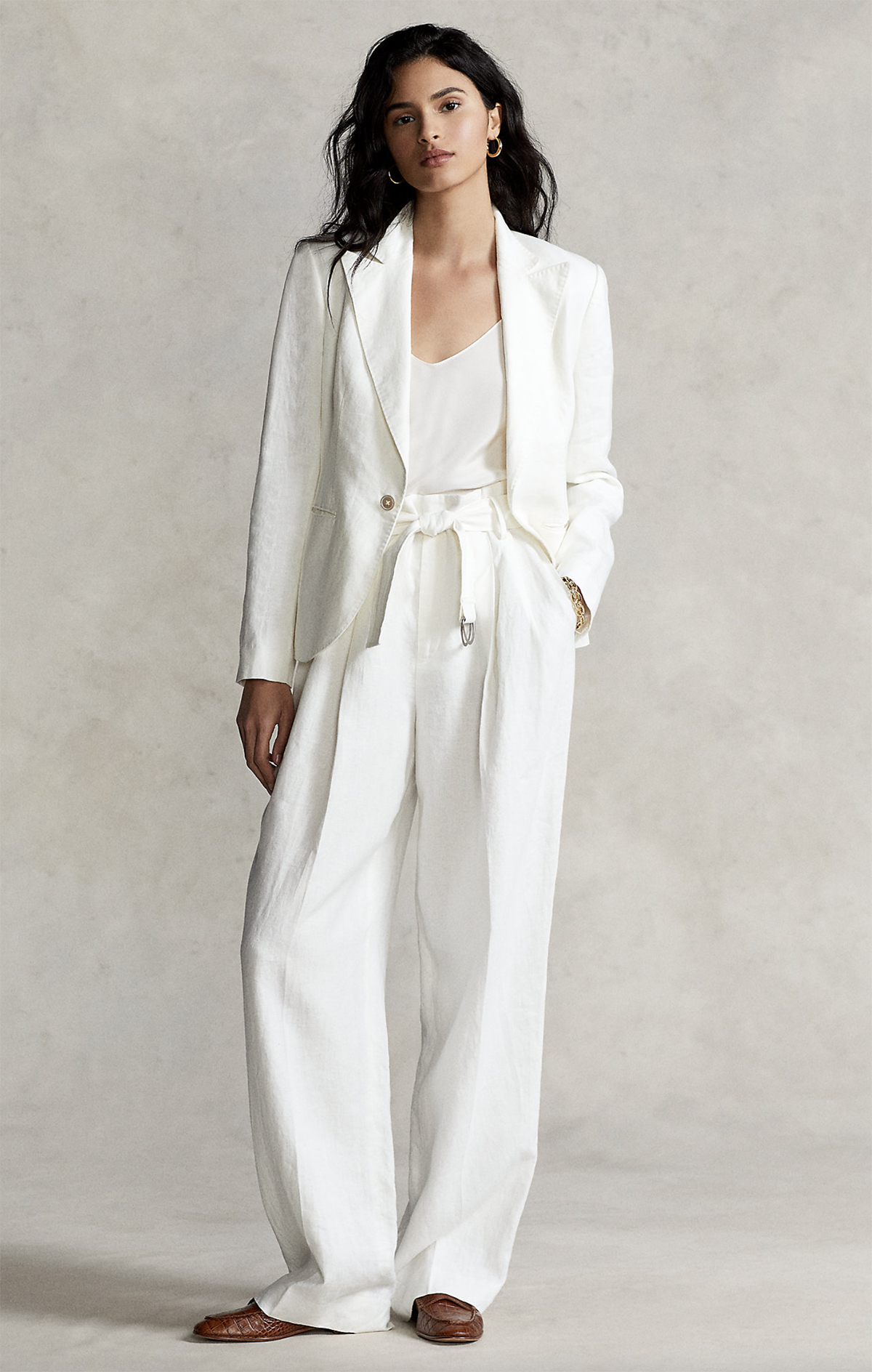 Ce pantalon ceinturé à jambe large met en contraste la texture froissée naturelle du lin léger avec les lignes épurées et la confection d’inspiration masculine. Les boutons en nacre véritable à l’éclat lumineux ajoutent une touche de luxe aux poches arrière.