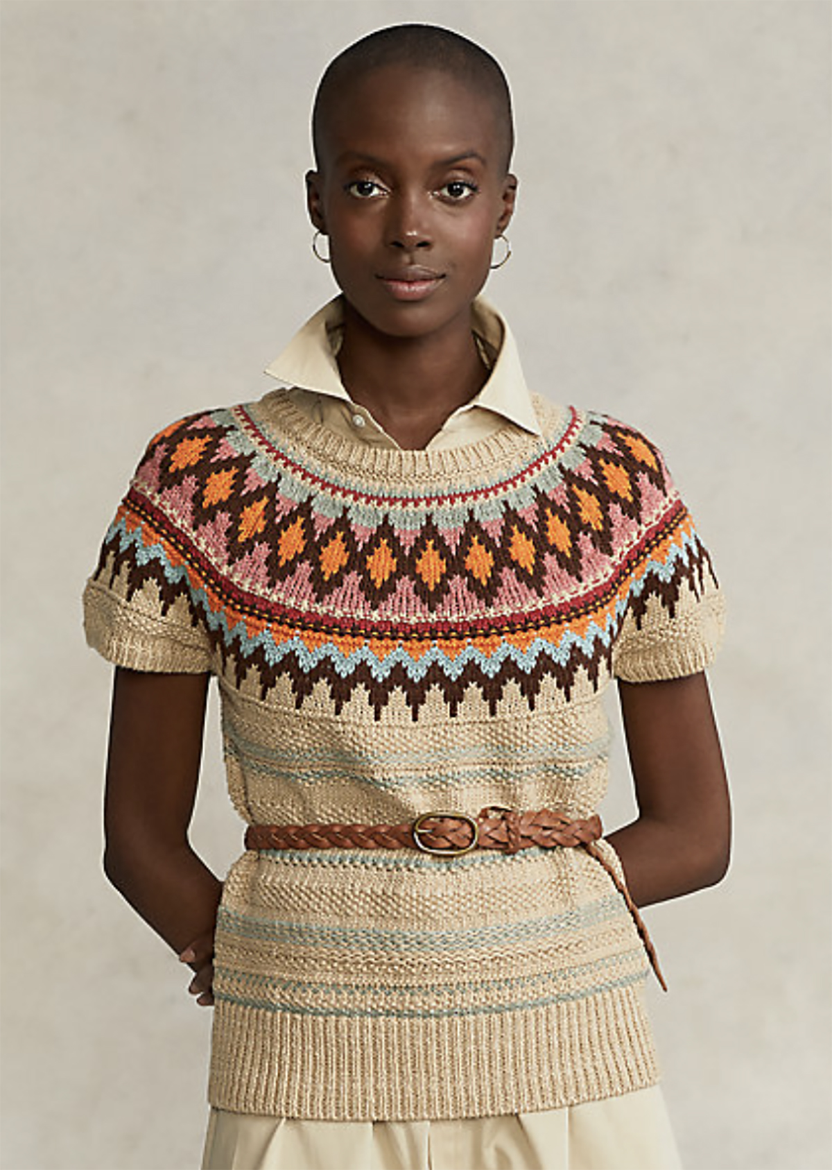 Pull à manches courtes en jacquard. Un motif losange en jacquard coloré borde l’encolure de ce pull à manches courtes, tandis que de nombreuses techniques de tricot lui confèrent texture et profondeur. Son mélange épais se compose de fils de coton et de lin dont certains proviennent du Japon et d’Italie.