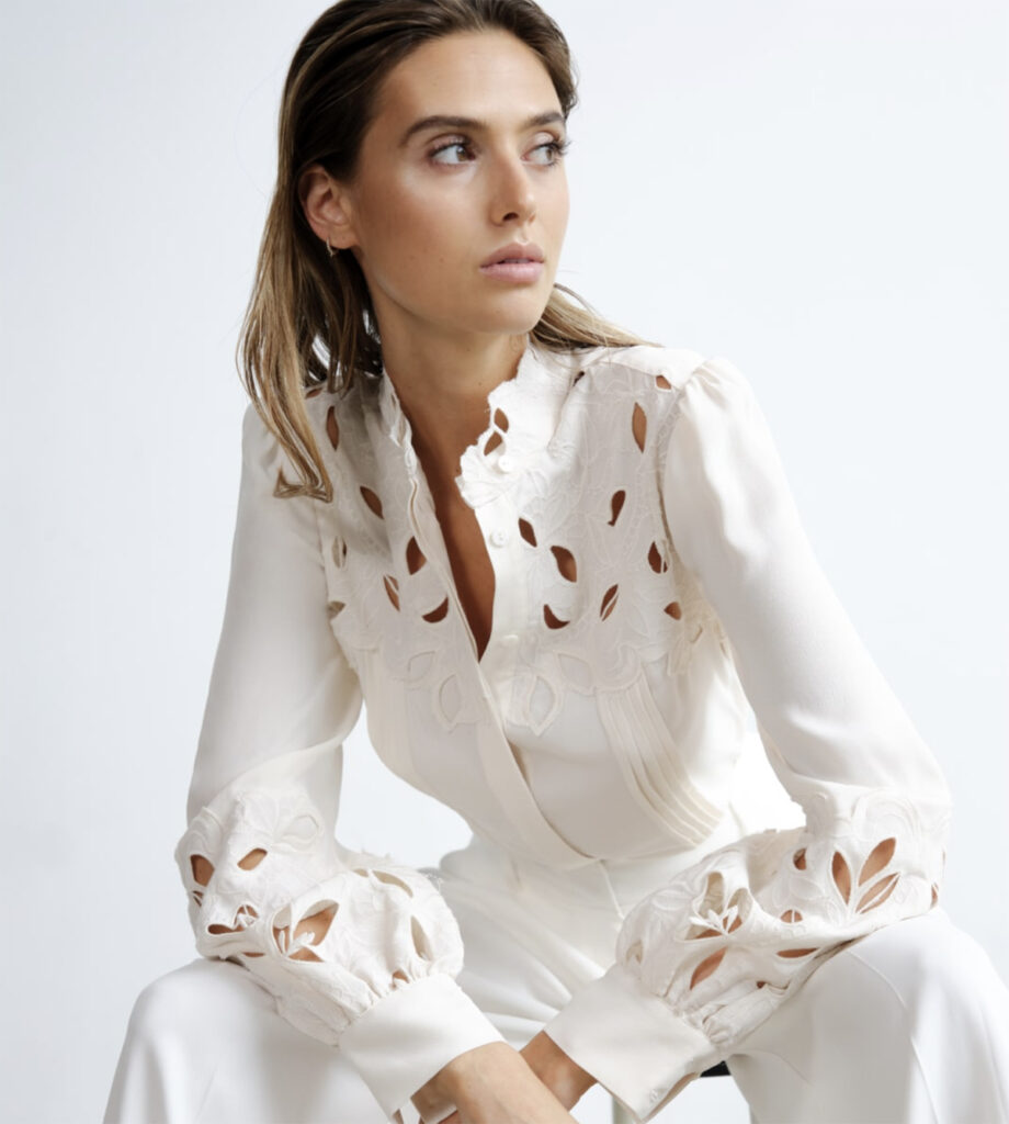 CHEMISIER DOTÉ D’UNE COUPE SANS COL ET D’UNE FERMETURE BOUTONNÉE DISSIMULÉE. SANS COL. MANCHES LONGUES. POIGNETS BOUTONNÉS. PLI CREUX INVERSÉ. CONCEPTION DE DENTELLE. DÉTAIL PLISSÉ. COUPE RÉGULIÈRE.