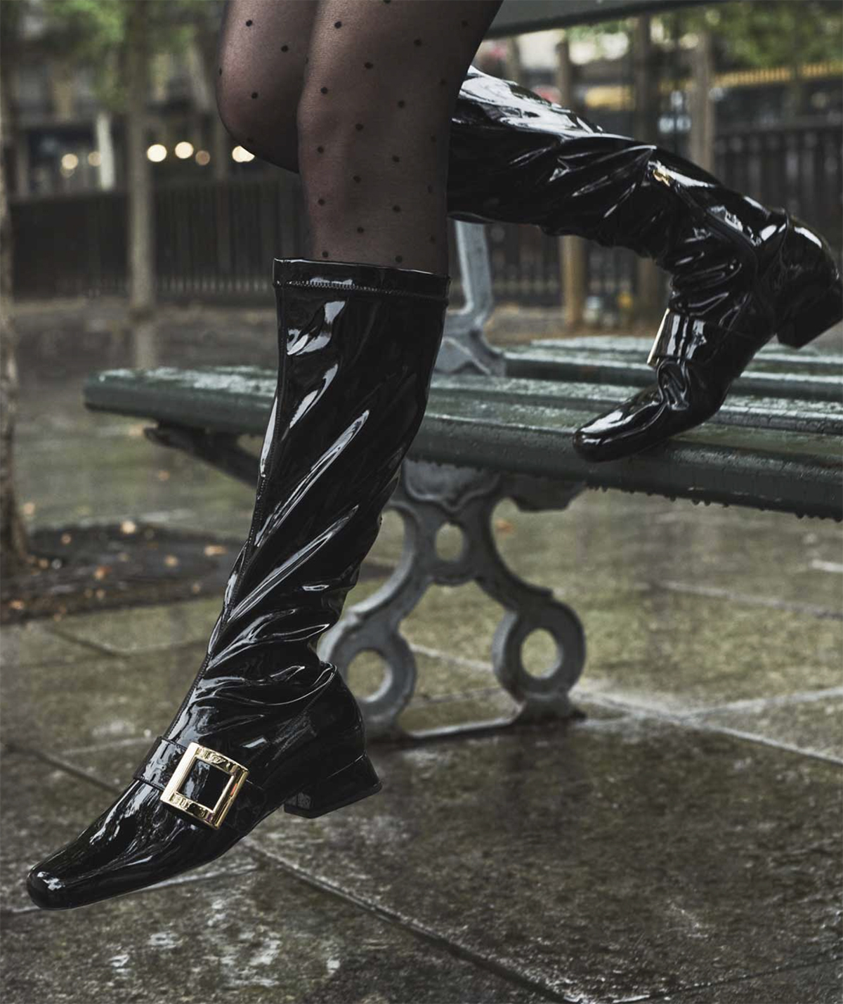 Avec une boucle en métal brillant et un talon structuré, ces bottes stretch en cuir verni rendent hommage au style des années 60.