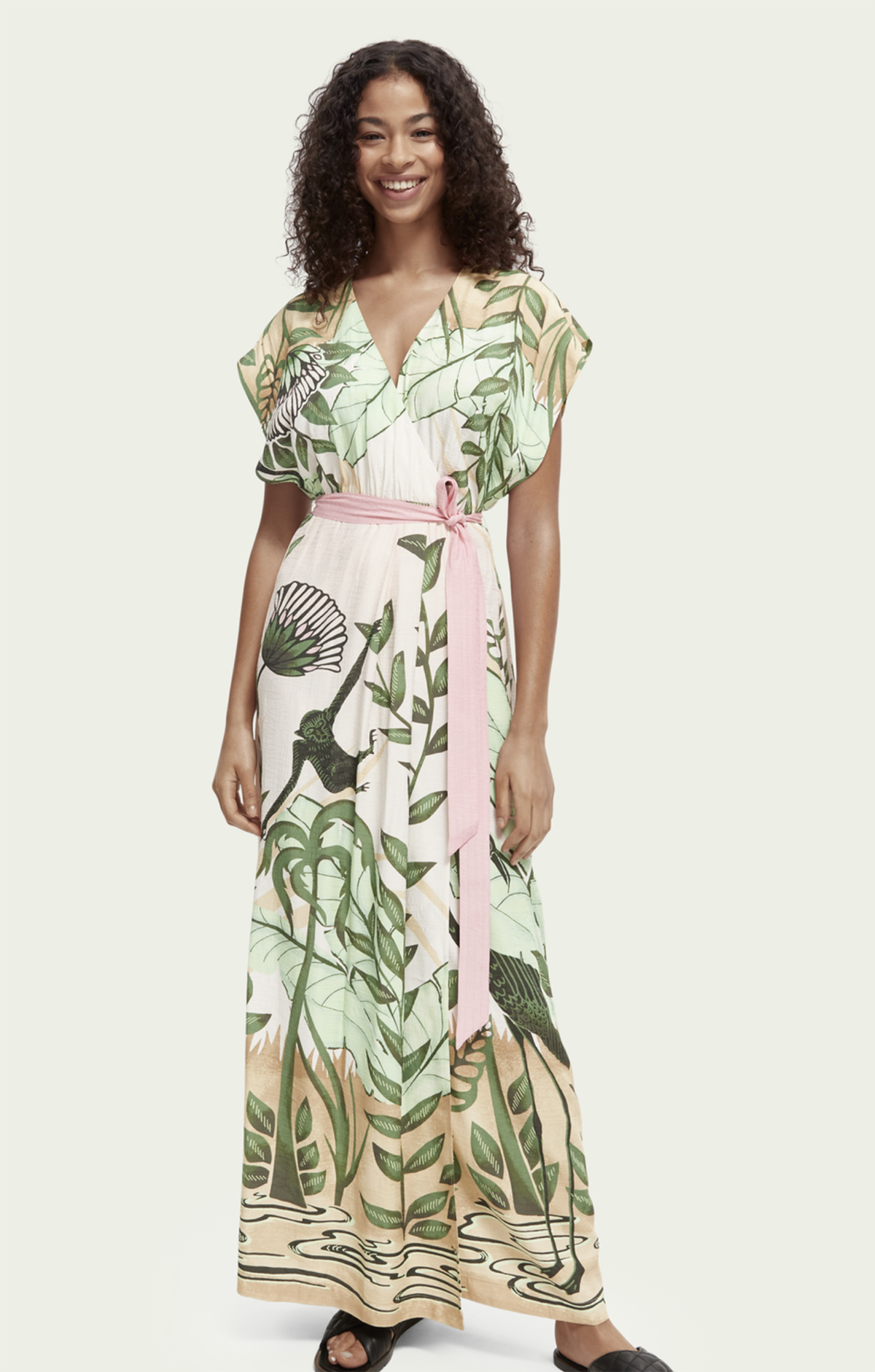 Avec son imprimé d’inspiration botanique, cette robe longue incarne parfaitement la belle saison. Elle ose même un surplus d’élégance grâce à un nœud papillon à la taille.