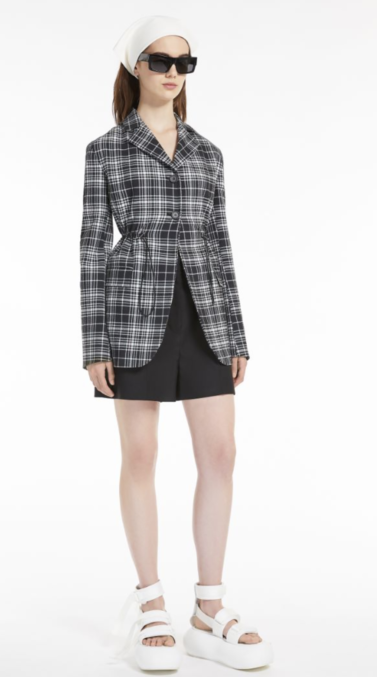 Blazer à carreaux en seersucker de coton/viscose mélangés. Le design hybride présente une coupe d’épaule et des revers sur mesure qui se combinent avec le détail du cordon de serrage qui adoucit la taille. Fermeture à deux boutons, ourlet arrondi légèrement ouvert et manches larges.