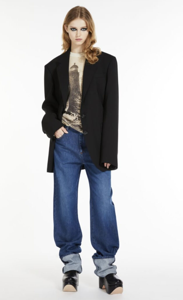 Jean extra long taille basse. Fermeture par zip et bouton-pression métallique, en plus de surpiqûres en fil de couleur contrastée.