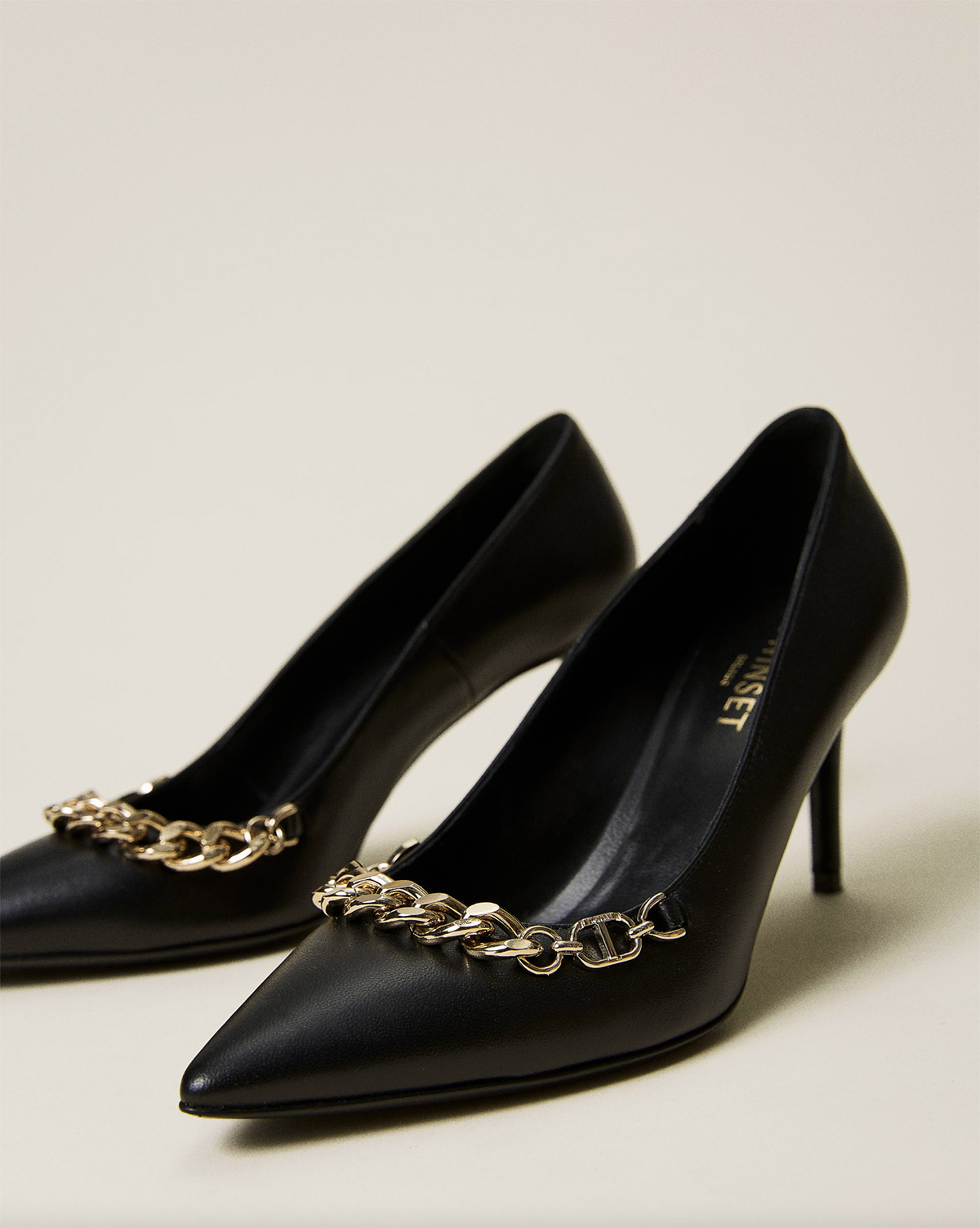 Escarpins en cuir avec chaîne et logo Oval T, bout pointu, talon stiletto, semelle en cuir.