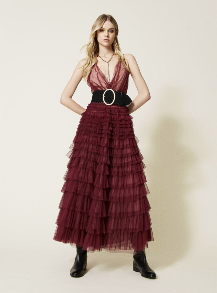 Robe longue en tulle plissé. Coupe évasée.100 % polyester. Doublure 1 : 100 % polyester. Doublure 2 : 100 % polyester.