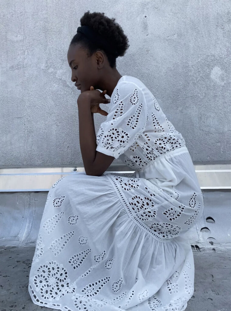 La robe à encolure en V a une manche froncée , une jupe à plusieurs déchirures avec une fente sur le devant , des poches sur les coutures latérales et un cordon de serrage à la taille pour ajuster la coupe . La robe et la sous-robe sont en 100 % coton et peuvent être lavées au cycle délicat, mais doivent être suspendues pour sécher.