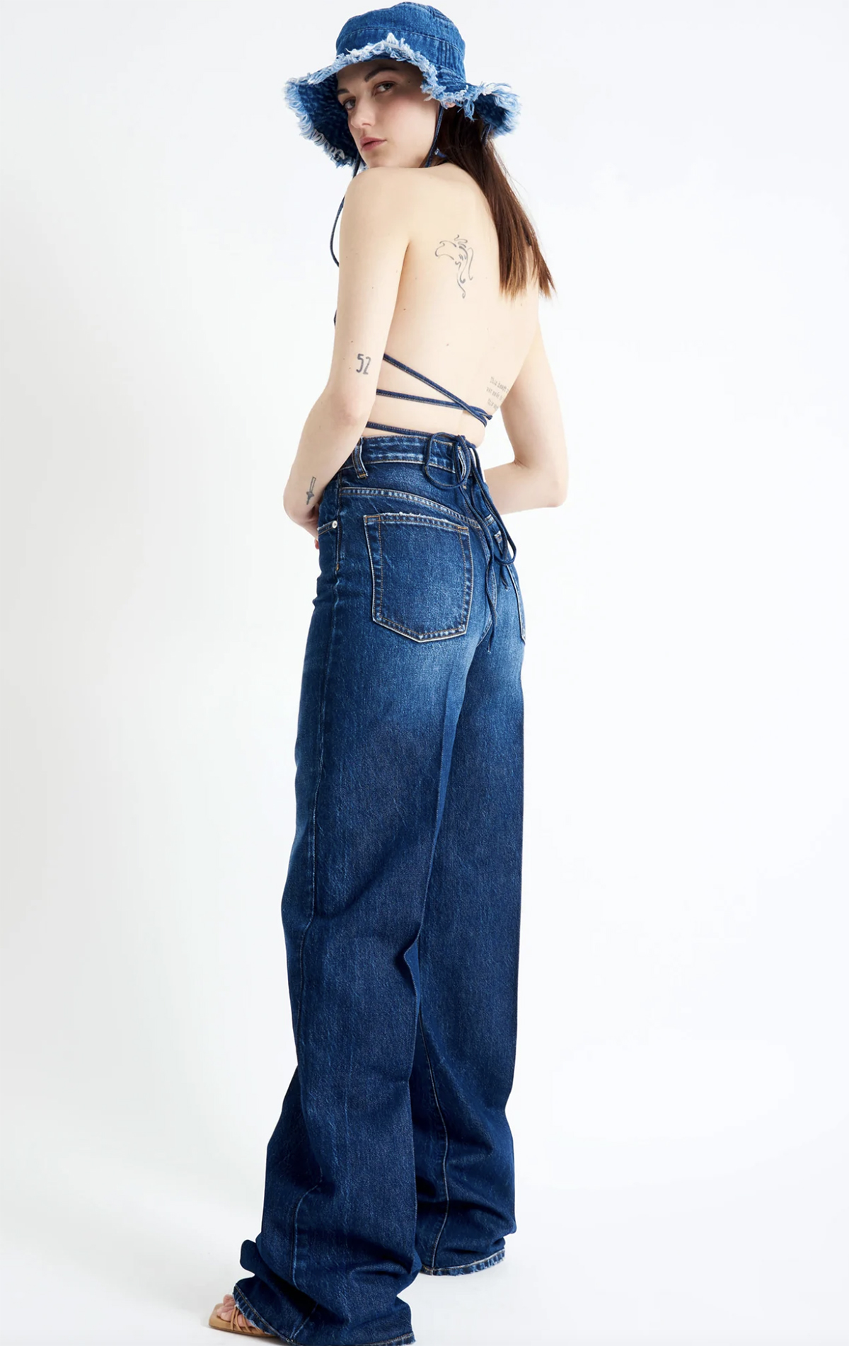 Jean palazzo long taille haute. Modèle cinq poches. Fermeture éclair et bouton.