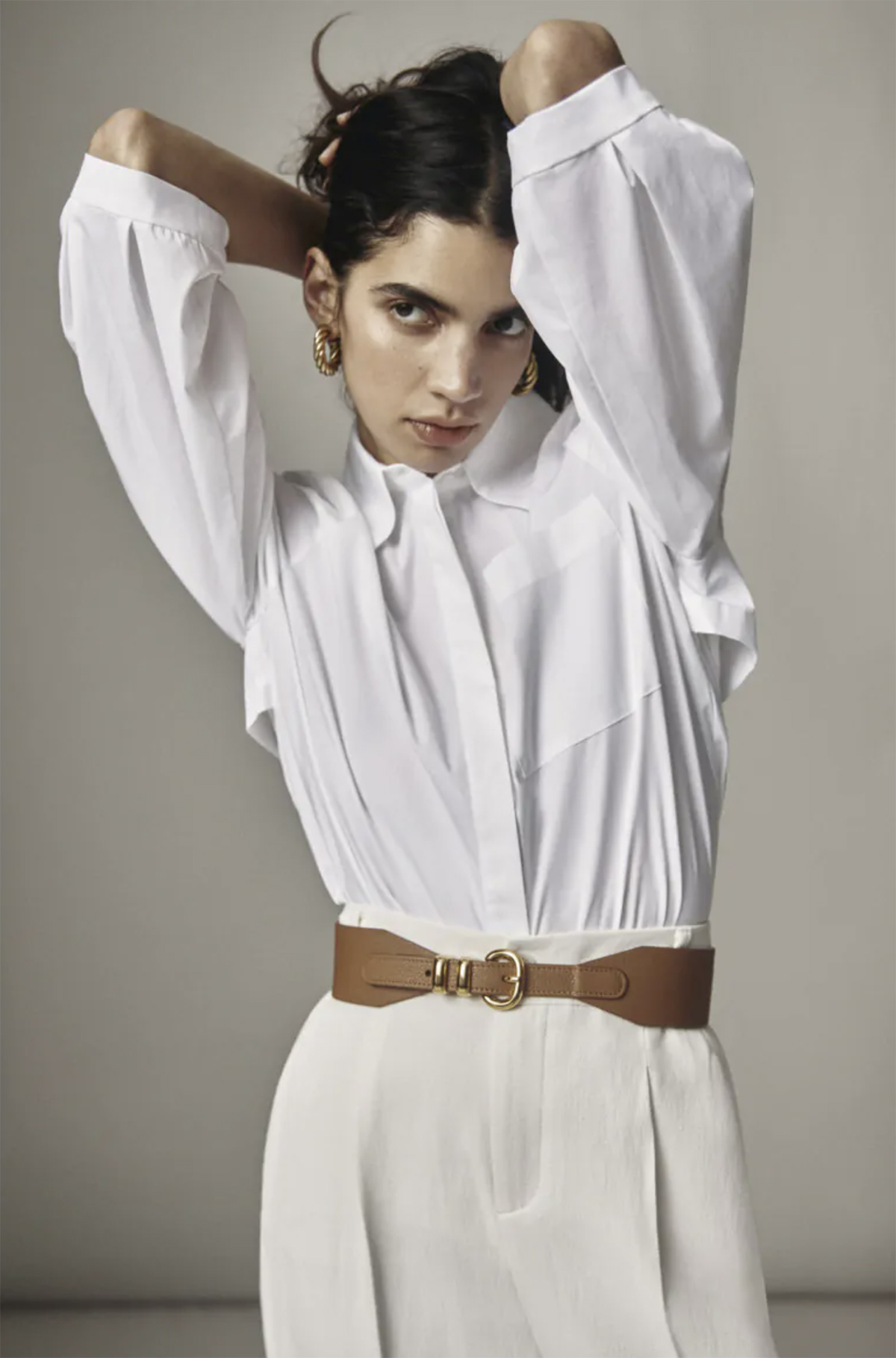 Un basique par excellence qui doit absolument faire partie de votre garde-robe : le chemisier blanc. Vous ne pourrez plus vous passer de ce chemisier blanc doté de larges manches trois quarts. IL arbore une coupe ample et est agrémenté, dans le dos, d’un détail particulier qui rappelle le trench-coat. Cet élégant chemisier se combinera à l’infini avec chaque pantalon de notre collection Iconic.
