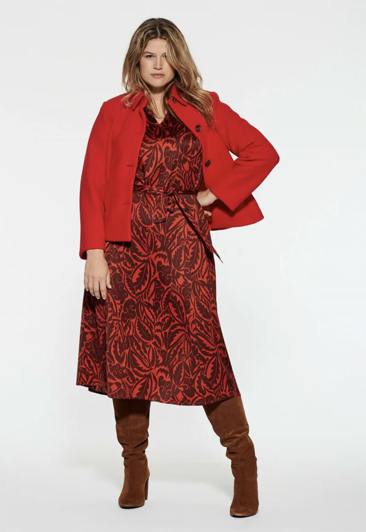 Robe midi confectionnée dans une viscose souple et extensible. La robe est dotée d’une jolie encolure en V et de manches trois quarts dont le bord est rehaussé d’une élégante échancrure. Vous voulez mettre votre taille en valeur ? Portez cette robe ample avec le ruban à nouer assorti. Combinez la robe avec un pull bordeaux ou rouge pour créer un ensemble élégant.